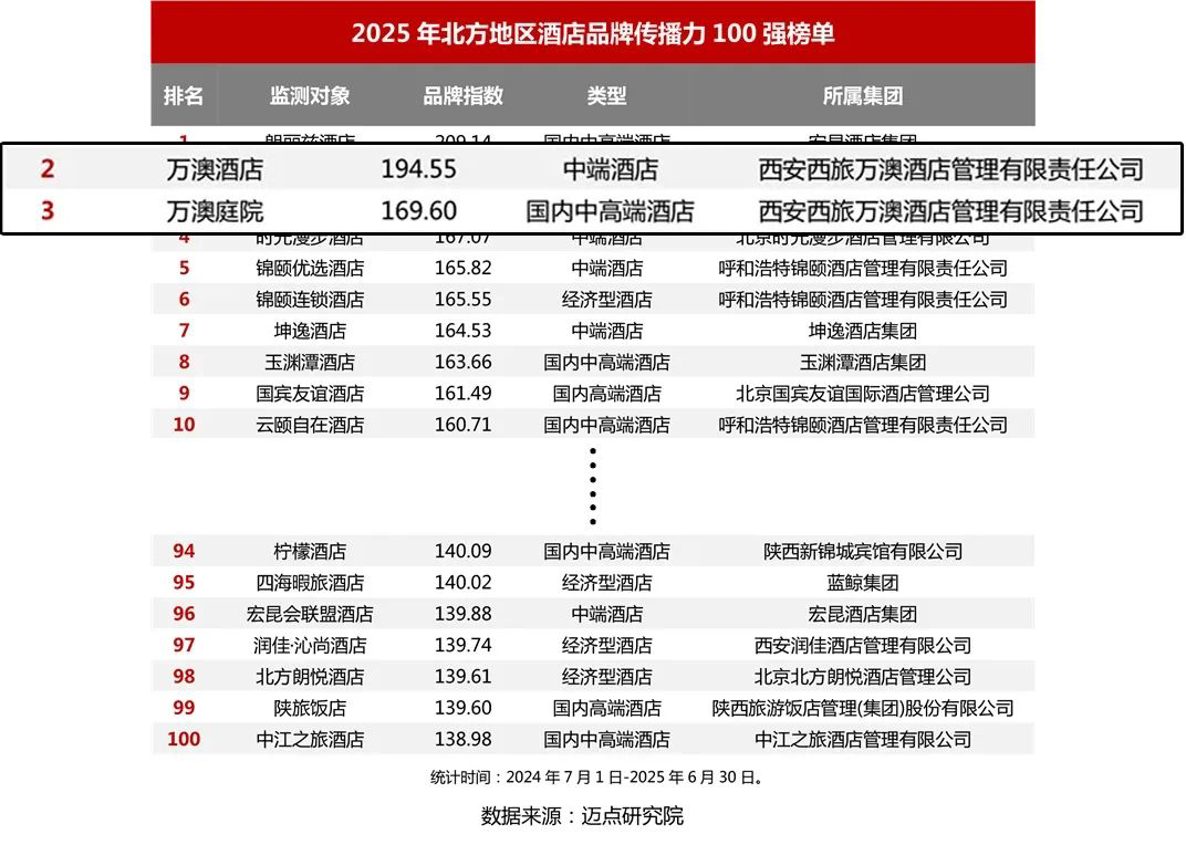 近日,西旅萬澳酒店旗下「萬澳酒店」&「萬澳庭院」憑借廣泛的品牌影響力和出色的創(chuàng)新傳播能力,躍居邁點研究院(MTA)“2025年北方地區(qū)酒店品牌傳播力100強榜單”前三甲。