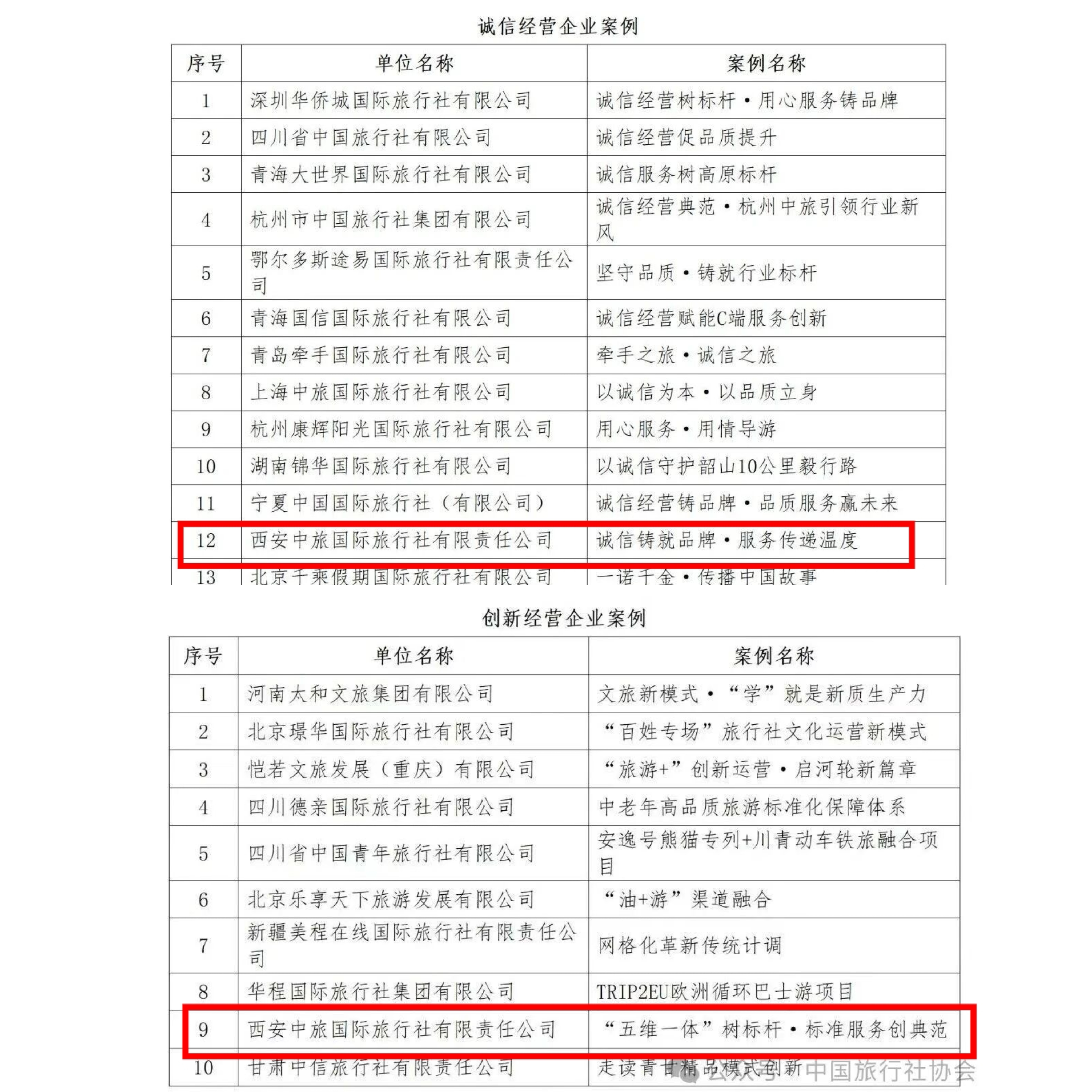 近日,“第八屆中國(guó)旅行社協(xié)會(huì)旅行服務(wù)案例榜單”正式揭榜,西旅股份旗下西安中旅創(chuàng)建的「誠(chéng)信鑄就品牌·服務(wù)傳遞溫度」和「“五維一體”樹(shù)標(biāo)桿·標(biāo)準(zhǔn)化服務(wù)體系」兩個(gè)案例,分別斬獲“誠(chéng)信經(jīng)營(yíng)企業(yè)案例”和“創(chuàng)新經(jīng)營(yíng)企業(yè)案例”榮譽(yù),彰顯了西安中旅在“誠(chéng)信經(jīng)營(yíng)”和“標(biāo)準(zhǔn)化服務(wù)”方面的優(yōu)勢(shì)和廣闊前景!