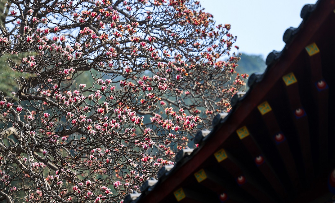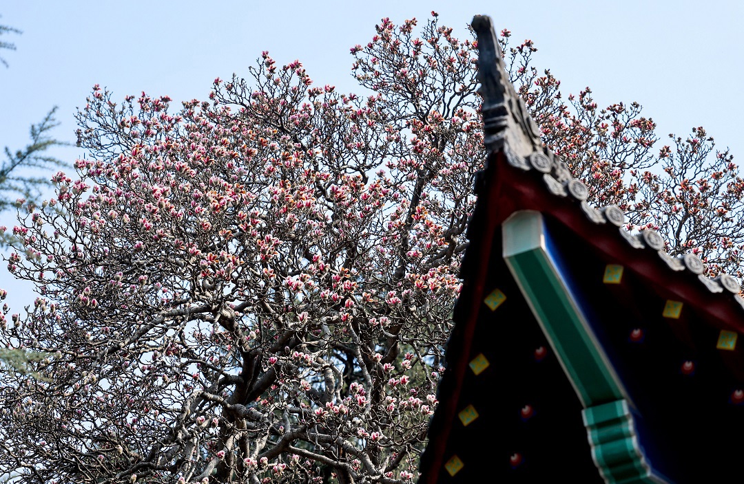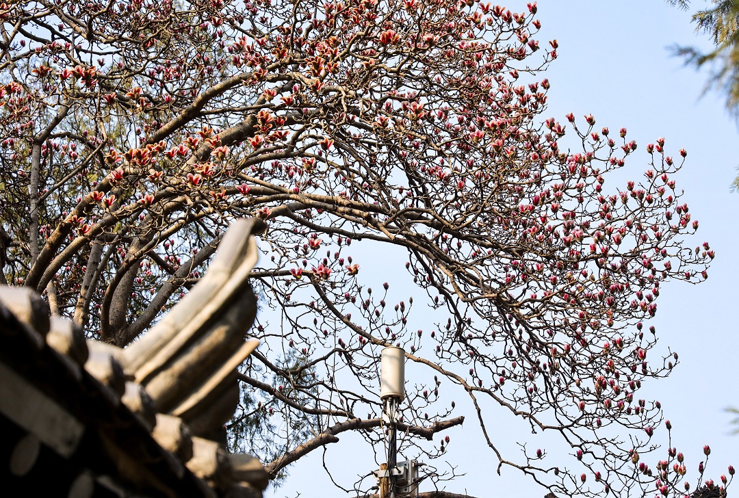 3月15日,位于秦嶺終南山下南五臺(tái)的兩株千年古玉蘭優(yōu)雅綻放,粉色花朵綴滿枝頭,清香陣陣,沁人心脾,為古城西安的春天增添了一道亮麗的風(fēng)景。