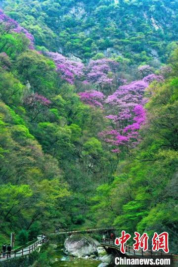 4月11日,漫山紫荊花與秦嶺交相輝映。太平國(guó)家森林公園供圖