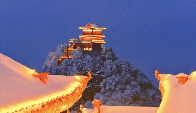 瑤臺仙境的煙火氣息,當(dāng)夜幕降臨燈光亮起,南五臺又呈現(xiàn)出另一番迷人的景象:飛檐斗拱被勾勒出清晰的輪廓,暖黃色的燈光映照在雪地上,為這清冷的冬夜增添了幾分溫暖。